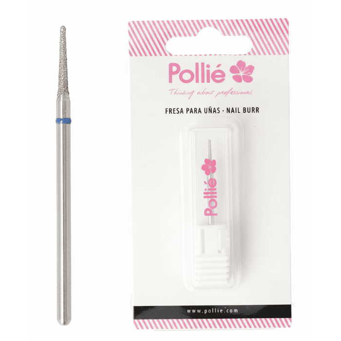 Broca cónica longa em aço inox fina POLLIE (3/32”). Precisão para cutícula, laterais e sob a borda livre. Menos aquecimento e acabamento limpo.