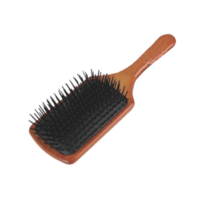 Escova de madeira com dentes de plástico, indicada para desenredar sem puxões e pentear cabelos longos dando brilho.