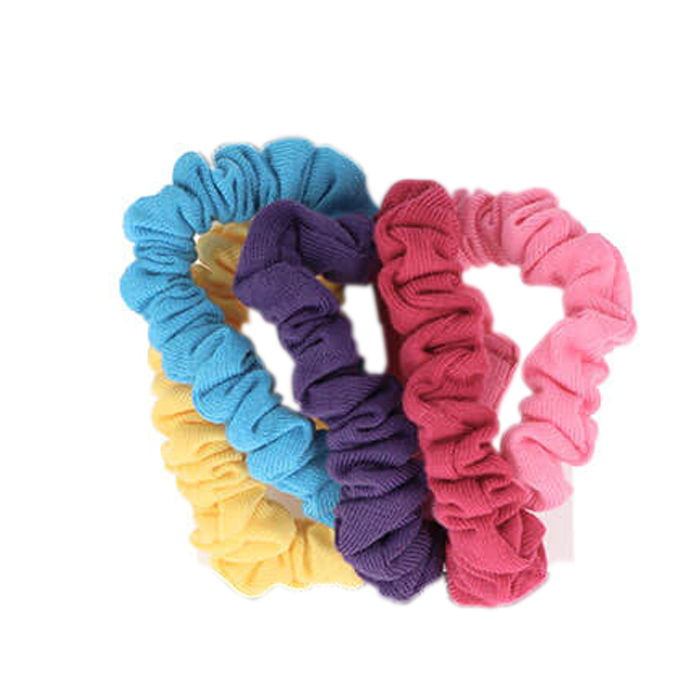 Embalagem de 5 elásticos coloridos com tecido para evitar danificar o cabelo.