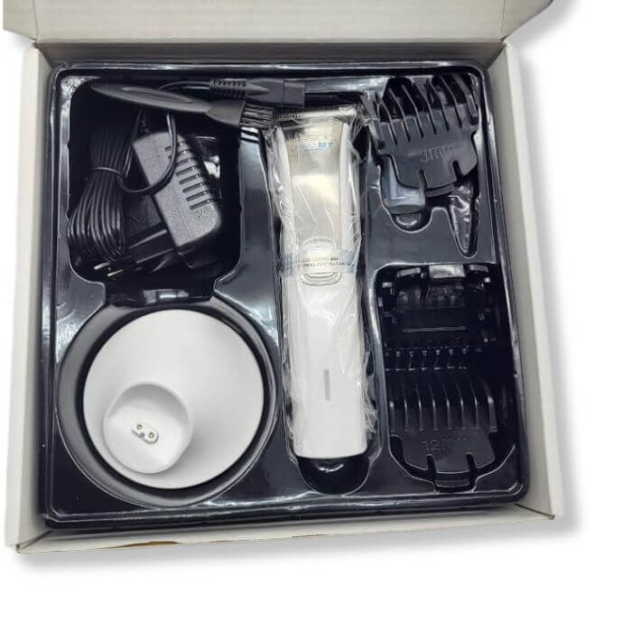 Máquina Hysoki Pro 12 Trimmer na Ana Mandara | Motor de 3,7V, lâminas de aço inoxidável e bateria de lítio. Inclui pentes guia, base de carregamento e mais.