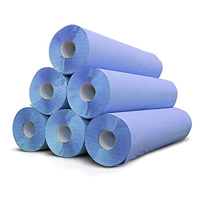 Caixa com 6 rolos de papel vegetal descartável, cor azul.
