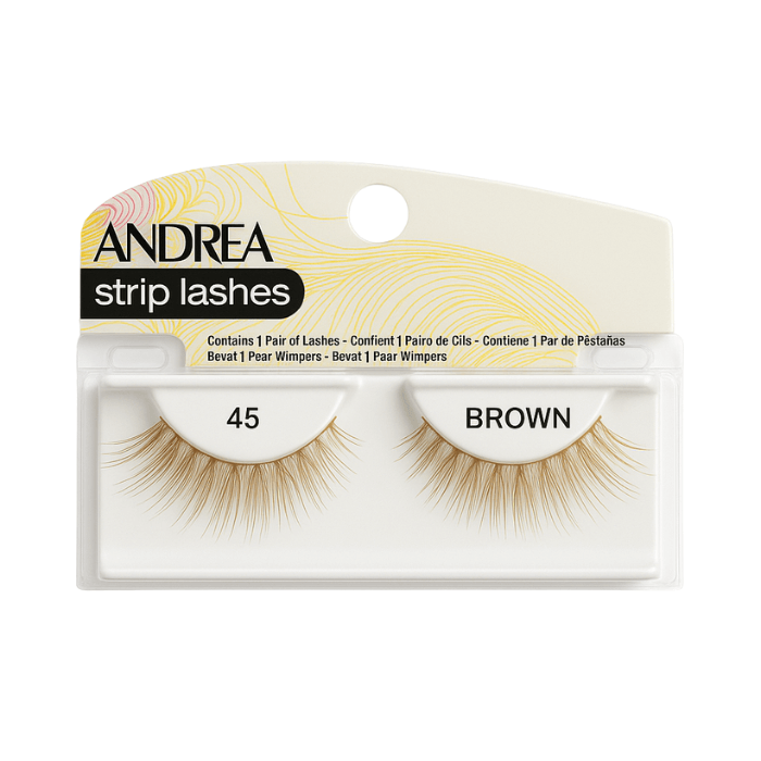 Pestanas Andrea SM 45 castanhas. Curvatura com efeito lifting e tom natural. Leves, reutilizáveis e perfeitas para um olhar suave e expressivo.