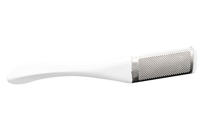 Raspa calos metálico com punho de plástico. Este utensílio é usado para separar as durezas dos pés. Recomenda-se molhar os pés antes de usar e, em seguida, hidratar com creme hidratante ou loção, para a área de endurecimento.