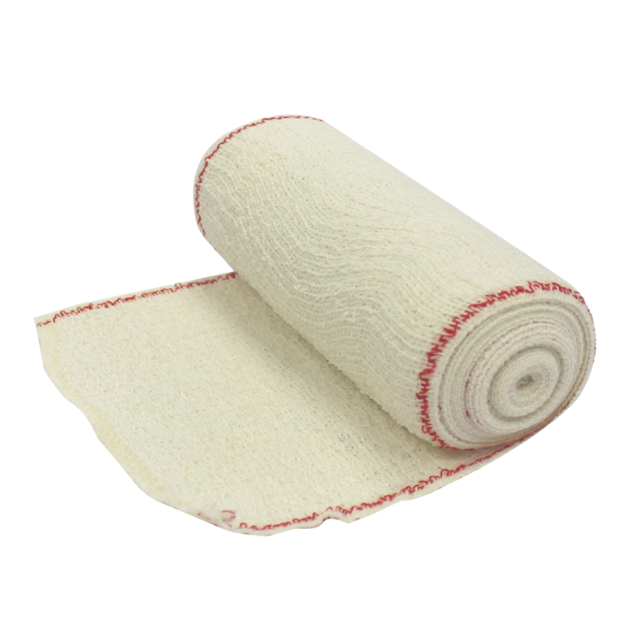Ligaduras de tratamento crepe em off-white com duas linhas vermelhas.